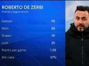 德泽尔比此前执教布莱顿在英超出战70场胜率仅37%,场均1.39分